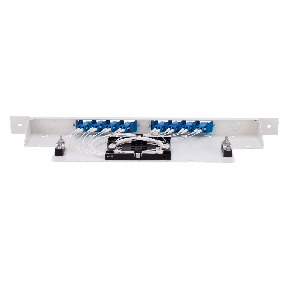 Patch panel de fibra óptica con 8 conectores LC, fácil montaje.