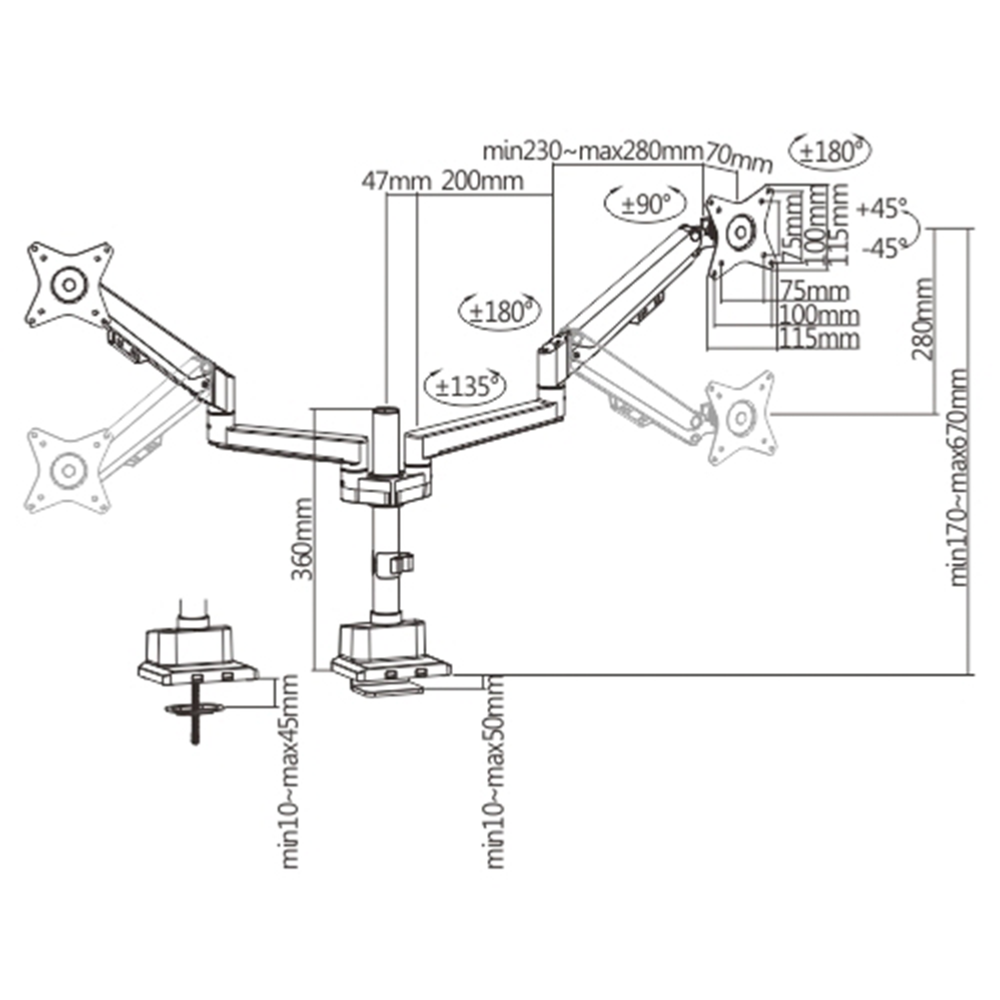 Un soporte de doble brazo de instalación en mesa para monitores es un accesorio diseñado para sostener y ajustar los dos monitores de forma ergonómica. Se fija al borde o a la superficie del escritorio mediante una base o abrazadera, y permite mover el monitor con libertad en diferentes direcciones: altura, inclinación, giro y distancia.