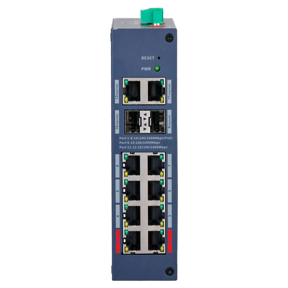 8 puertos PoE RJ45 Gigabit + 2 puerto RJ45 Uplink Gigabit + 2 puertos SFP Gigabit
