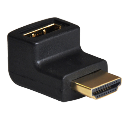 Adaptador HDMI que permite unir dos cables tipo A macho en un extremo y hembra en el otro. Su posición en forma de L permite la conexión de cables HDMI en lugares con poco espacio o de dificil conexión.