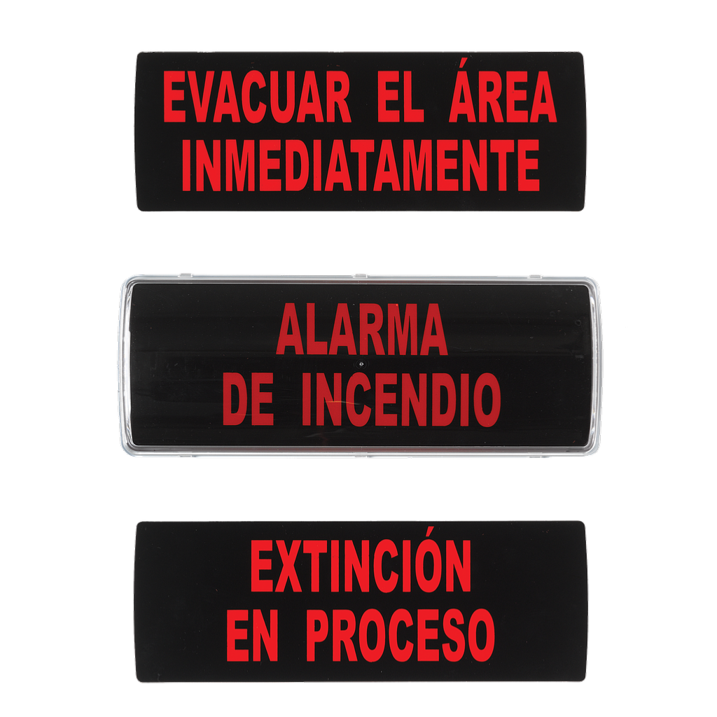 3 insertables Alarma de Incendio, Evacuar el Área y Extinción en Proceso